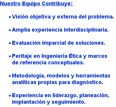 2) Seminarios para Directivos, Ejecutivos y Empleados, para estimular su capaci- dad de reconocimiento de prácticas corruptas en la orgnización, algunas formas de resolverlas, y el papel de cada nivel en el liderazgo de su detección y prevención. 3) Talleres y cursos a la medida, enfocados sobre rupturas éticas específicas, y cómo usar la Ingeniería Ética para evitar su recurrencia. 4) Diagnósticos de la Ingeniería Ética de la organización, para hallar oportunida- des de mejora en la calidad y alineación de Liderazgo, Arquitectura Moral y Capital Humano. 5) Consultoría, "Coaching" y Asesoría para resolver problemas de corrupción y dearrollar estrategias para infundir a la integridad dentro de la cultura de la organización.